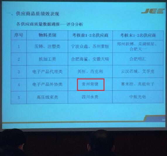 本次大会以“合作发展”为主题,聚焦“匠心精神”,会上深情回顾了“江淮巨一”2016年发展目标及完成情况,以及对供应商质量管理工作的绩效。同时结合当前形势,提出了2017年的质量提升计划,并在2016年采购基础上,展示了2017年采购工作计划。在2016年供应商品质绩效评价中,CJE在电子产品外协类中被评定为前1-2名的供应商,这是JEE对CJE电容器品质的肯定。